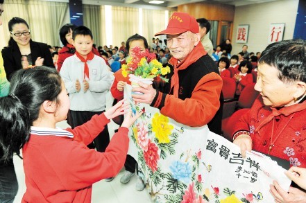 下午,芙蓉区燕山二小的老师和同学们将王光亚老人请到学校过生日。燕山二小的300多名老师同学们在这里为王光亚精心准备一系列精彩的活动:孩子们表演歌舞、诗朗诵等节目,送上了自己的美术、书画作品,同学们还在一幅1米多高的寿字图上争先恐后地签名,为王老系上红领巾。王光亚老人兴致高涨,为孩子们讲述了当年的战斗故事,当年的许多细节描述得很清楚,坐在最后一排的四年级学生朱志湘一直伸着头听得入神,她告诉记者,她以前从来没有听过这些故事。