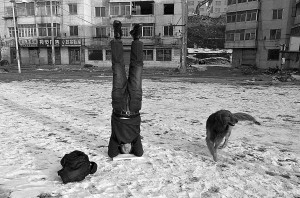 老人在雪中练习倒立