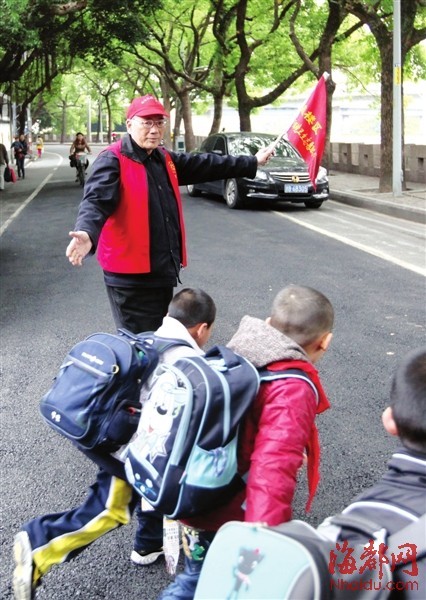 上午10点50分,老刘出门了。他来到乌山小学附近路段。“这里下坡,车子多,车速也不慢。”老刘说,有些学生会在路上嬉闹,他觉得很危险,就义务当起协管员。车流中,只见老刘手拿小红旗,头戴小红帽,还穿着一件红马甲。见到学生要过马路,他会把手中的小红旗一挥,拦下过往的小车。可别小瞧老刘手中的小红旗,路过这里的小车只要见到红旗,就会停车。“爷爷!爷爷!”这是附近学校的学生对老刘的称呼,每次听到有孩子叫他,老刘总会涌出一种幸福感,更觉得自己有义务保护这些可爱的孩子。