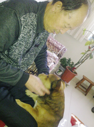 丁大爷刚坐下,两只小狗就把前爪搭到了他的腿上,记者看到其中一只黄色小狗的左眼上有一层白色的异物,右眼里也有一小块白色的斑,丁大爷说: “这是我2008年腊月收养的第一只流浪狗,是附近工地打工的工人养的,后来它就被遗弃了,在小区里流浪。开始被前楼的人收养了一阵子,后来工人走了,又 跑出来了,不知怎么两只眼睛就全看不见了。我第一次看见它的时候是在门口的草坪上,我一看见它眼睛上的白雾,就赶紧去外面买药准备给它治疗。开始它还不进 屋,后来每天给上药、喂食,时间久了就敢进屋了。开始两个眼睛都看不到,经过涂药、喂消炎药,右边的眼睛就能看见了,然后就一直养到了现在。”