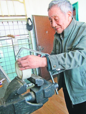 图为谢定义老人正在研究加工自行车变速器。