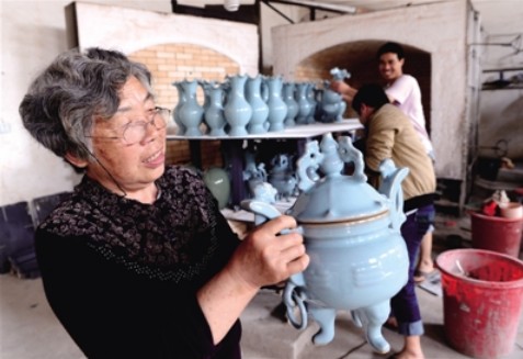 中国陶瓷艺术大师、国家级非物质文化遗产项目代表性传承人孟玉松已是一位72岁的老人,几十年来,她把全部精力投入到汝瓷研究和恢复工作中,为汝窑的发展创新作出了巨大贡献。孟玉松主持研究成功的汝官瓷(天青釉)和月白釉填补了我国陶瓷史汝窑制作的空白,使一代名瓷重放异彩。如今,孟玉松老人每天仍然在自己的汝瓷作坊中精心创作、生产和研究,宣传汝瓷文化。 新华社记者 赵鹏 摄