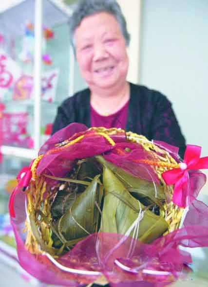 盛凤英是崇川区虹桥街道虹东社区出了名的才艺达人,能唱越剧,会跳广场舞,还曾参加过某卫视举办的“中国达人秀”节目;在手工上,做虎头鞋也是老人的强项。在今年的端午节前夕,78岁的盛奶奶又闲不住了。“端午节,少不了包粽子,但赠送亲朋好友时,用个塑料袋子一拎,又太普通了。”盛凤英说,看看商场、超市里销售的粽子,将不同品类组合用礼盒一装,成本几十元的粽子卖出了上百元的价格。受之启发,盛凤英也想把自己亲手包的粽子再好好“包装”一回。