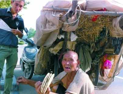 100公斤麦秸秆装车,上面覆盖着塑料膜,年近七旬的张学武老人弓身穿行街头,拉着它们显得颇为吃力!6月16日下午,在郑州市嵩山南路,一位等活的民工目睹此景心头泛酸——老人的境况,极像父亲当年辛苦操持家庭;他赶紧掏钱买下麦秸,让老人回家。