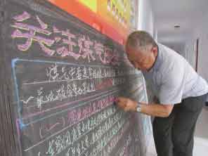 今年66岁的姜远老人是通钢一位病退的工人,他因工作原因患有矽肺,稍微活动就会喘息,每年春秋总会住院治疗。姜远在退休前曾在单位做过板报宣传,有着丰富的经验。退休后便主动承担起社区的板报绘制工作,把自己这方面的特长充分运用到社区的宣传工作上,成了社区义务“宣传员”。