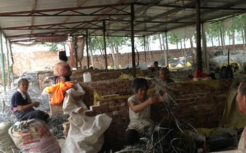 在这个家庭小作坊,主要从事将废旧电线中的铝线手工提炼出来,由铝厂回收再利用。