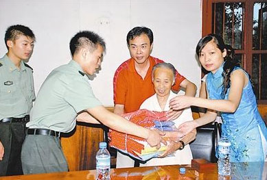 7月30日一早,一位老阿婆拄着拐杖在社区工作人员搀扶下,专程来到四川省内江军分区慰问官兵。