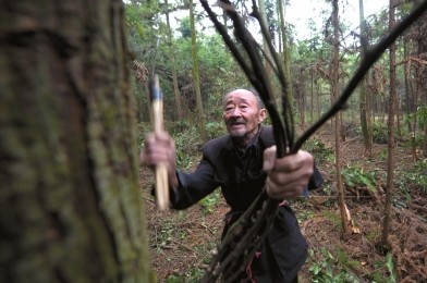 尽管已是92岁高龄,他的脚步依然很快,看到长势不好的树苗,就用手中的镰刀修整;修整下来的树杈多了,他用尼龙绳捆好,搬回家里作柴烧。一年四季,漆友朋每天只吃两顿饭。他说,“中午省下的时间,还可以在山林里转一圈,多干点活。”