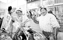 18日,在济南火车站站前,两位身着黄色丝绒羽毛衣的“鸟人”吸引了许多路人的眼光。原来,这是两位来自南京的老人在为环保做宣传,“鸟人”衣服成了他们的活招牌。