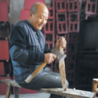 昨日上午,记者来到了王宏云的家,还没进门,便听到了“乒乒乓乓”的敲打声。原来,王宏云正拿着斧子在削一根木头做椅背呢。