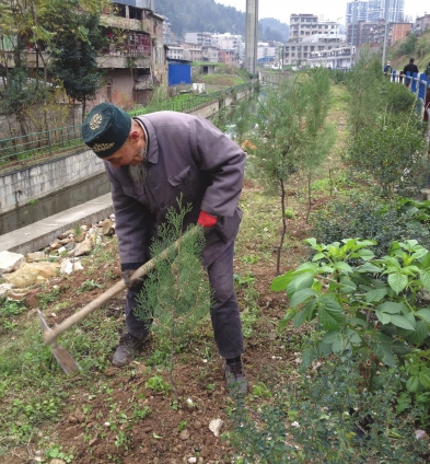 尽管绿化带已经长成,但老人又开始了他的养护工作。