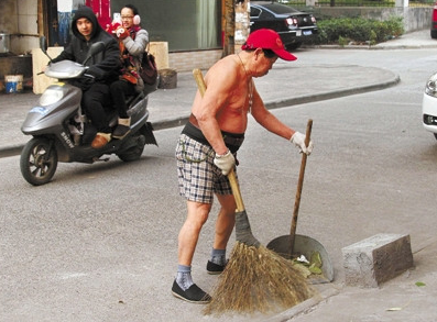 说起老杜的身体,他的邻居也是没有一个不羡慕的。每天早晨,老杜扫地的标准搭配是头戴“小红帽”,光着膀子,穿一条短裤,现在这么冷的天,也是这样的打扮。只是在气温零下的时候,会在老伴的叮嘱下穿上一件背心。