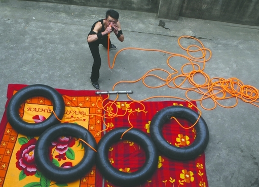 记者打开秒表,仅仅过了3分钟,2个车胎已开始微鼓。20分钟后,4个瘪轮胎竟然全部被吹胀了!除此之外,聂永兵还会脚踩刀尖、眼皮提水桶等绝活。老人说,这些本领都是他花了八九年时间“自学成才”的,初衷是强健身体,现在则梦想能走上达人秀舞台露两手。