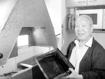 讲述了环保抽油烟机的基本原理后,于印珊老人拿出一个输液瓶,内外分别插着一根细管。“这跟水烟的结构一样,烟雾经过滤后吸入口中,环保抽油烟机也是这样的构造。”于印珊老人告诉记者,1995年,他从汽车制造厂退休,经常看到报纸上刊登饭店排放的油烟影响居民生活的报道。于印珊老人就想动手制作一台能够净化油烟的抽油烟机,老人第一个想到的就是碱水。有了吸油的武器,于印珊老人便开始琢磨抽油烟机的构造,经过两年的研究,1997年,老人制作出了第一台环保抽油烟机。