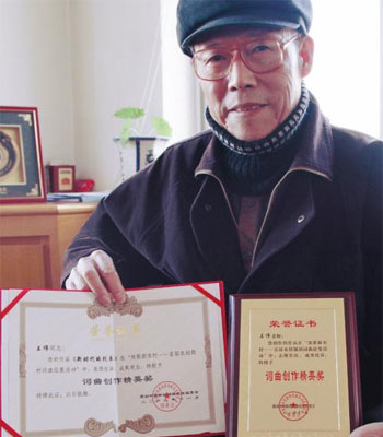 在写文章的同时,王老还琢磨起了作词作曲。为了谱曲,老人自学乐理知识。从2007年至今,他创作了30多首歌曲。今年1月,王老得到一个消息,感动中国新创词曲选拔组委会面向全国征集原创歌曲,词曲要经过全国著名词曲家审核方可入围。王老马上投入到了创作中……