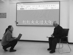 老人扶着花镜,指着LED屏,“这字要是变成楷体,再倾斜一点儿就好看了。”旁边的邢艳萍一听,赶紧在笔记本电脑上修改。“蔡老师,您看是不是这意思?” 蔡蓝田笑着点点头,“对,哎呀,这高科技就是好。”随后老人又在纸上画出几个图案,告诉邢艳萍怎么排列,很快,邢艳萍就在电脑上设计出了完整的内容。