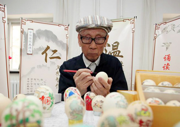 别人眼中普通的鸡蛋壳,经过81岁的郭述曾一笔一画,毫厘之间一幅幅山水人物栩栩如生,摇身一变成为了精美的艺术品。7年间,他前后创作了千余件“蛋壳画”作品,最近,郭述曾创作了一组主题为“美丽天津”的作品,小小的鸡蛋壳满载他对家乡的热爱。在蛋壳上作画并不是件容易事,小小的蛋壳易碎不说,而且表面不容易着色,为此郭述曾也费了不少心思,“我尝试了很多种办法解决着色的问题,淀粉、面粉都试过,用他们擦拭蛋壳之后再用画笔画,上色就容易多了;而且蛋壳有些‘娇气’,有时拿的久一些或是不小心碰一下,就是一道裂纹;再加上蛋壳是立体的,和平面作画不同,很多线条都需要认真处理,这样才有好效果。”