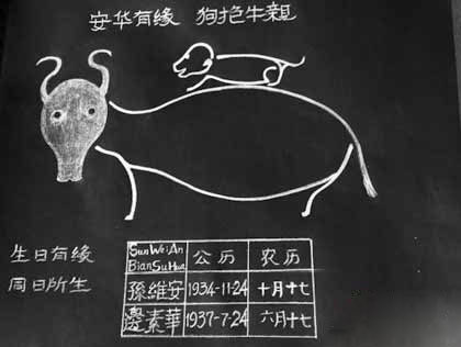 几个月来,他不仅用自己的姓名首字母作画,还为周围的亲朋做了类似姓名字母生肖画。老人的妻子于2003年患脑梗,孙维安不离不弃,每天拉着老伴散步锻炼,老伴瘫痪在床后也是他悉心照顾。3年前,老伴辞世,孙维安特别怀念妻子,专门画了两幅《牛人图》。卡通的图案里包含了老伴的姓名字母,也融入了对老伴的思念。