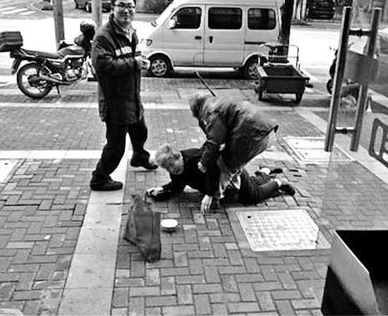 “上月28日下午3点左右,我在嘉兴永泰广场附近的一家面店吃面,老大爷拿着白色的碗站在店门口,还没乞讨,一位满头白发的老太走过去,突然跌倒在地。”目睹事件全过程的陈景轩告诉记者,乞讨老大爷看见后,迅速丢下手中的饭碗,边喊“老人家摔倒了,快去扶一下”,边过去搀扶老太。