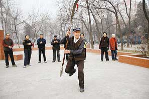 每天早晨,吕文礼老人都会扛着大刀准时来到大庆路街心花园, 他手中的大刀舞起来虎虎生风;脚下的毽子踢起来是上下翻飞,那娴熟的动作,让人根本看不出老人已是87岁的高龄。