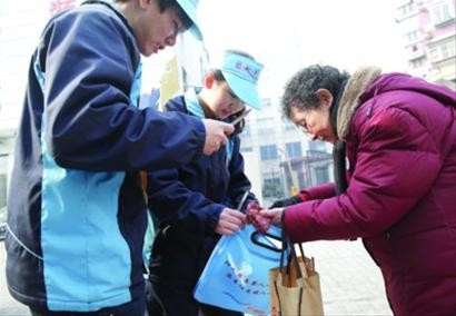 志愿者昨天在本市主要路段、交通枢纽、居民社区,引导过往路人自愿捐款。