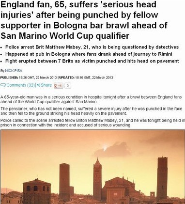 凤凰体育讯 北京时间3月23日凌晨,英格兰队8-0击败圣马力诺,取得一场大捷,不过根据《每日邮报》的消息,英格兰球迷却在意大利炮制了一起骇人听闻的惨案,有7名英国壮汉在博洛尼亚的一家酒吧对1名65岁的老人进行了围殴,目前伤者已经送往当地医院,生命垂危。