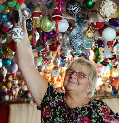 来自威尔士斯温西港莫里斯顿的西尔维娅·蒲柏奶奶是一个圣诞节小玩意的收集爱好者。今年70岁的她9月份就开始为即将到来的圣诞节开始做准备了。而由于今年1月蒲柏奶奶膝盖受伤,没法将这些饰品一件件取下来,于是天花板上的1800多件小饰品挂了整整一年。这些饰品是奶奶世界各地的朋友给她捎过来的,其中一些从埃及、希腊、拉斯维加斯等地寄来的饰品甚至价值23英镑(约合230元)。