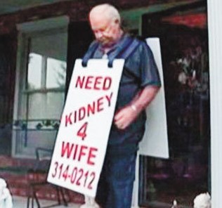 来自南卡罗来那州,今年78岁的斯威林(Larry Swilling)花了一年功夫,背着牌子在南卡罗来纳街头行走,央求陌生人捐肾救助他的病弱老妻。现在他终于心愿得偿,找到条件匹配的捐肾人,如果一切顺利,本月12日就可进行换肾手术。