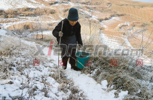 1月23日,洛南县景村镇脱岭村三组附近的山坡上白雪皑皑,道路仍然湿滑不堪,81岁的冯金秀老人佝偻着瘦弱的身体提着一个空桶去距离家约有300米的水窖打水。“手上没有劲,每次只能提半桶回去。”冯奶奶告诉记者。记者看到,冯奶奶家通往水窖的羊肠山路要穿过一片丛林和田地后才能到达,水窖深约1米,口径约50厘米,仅仅能放下去一个水桶。“这都是平时下雪或者下雨积攒的,你看,这会都冻住了。”舀水前,奶奶先用一根棍子敲开冰层。