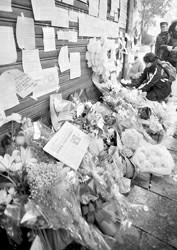 就在几天前,老人的身影没有在报刊亭里出现,大家就开始打听。24日报刊亭大门紧锁,贴出了老人去世的讣告。此后不到一天时间,报刊亭的门被鲜花簇拥着,大束的康乃馨、单支的白玫瑰、绽放着笑脸的向日葵……有的花中间还夹着明信片和字条,诉说着孩子们对爷爷的怀念。