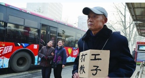 9点05分,一辆三路公交车缓缓驶入公交车站。程才安立马迎了上去,在匆匆下车的人流前,把写有“打工救子”的硬纸牌挂在脖子上。