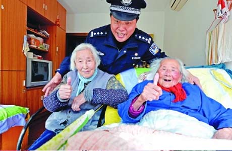 姐姐腿疼下不了床走不了路,一个电话打给贺大队长,他迅速赶来带姐姐去了医院;我们姐妹经常生病住院,贺大队长带着他的特巡警大队同志放弃休息,轮流守护照顾;为给我俩解闷,贺大队长三次送来电视机……这些都出自两位近百岁的老人张镜园和张娟长达14页的手稿。老姐妹提到的“贺大队长”就是玄武区特巡警大队原队长贺维宁,他在过去的18年里还带领身边近80名干警精心照料老人。昨天,记者来到“博爱老年公寓”,见到了两位老人。