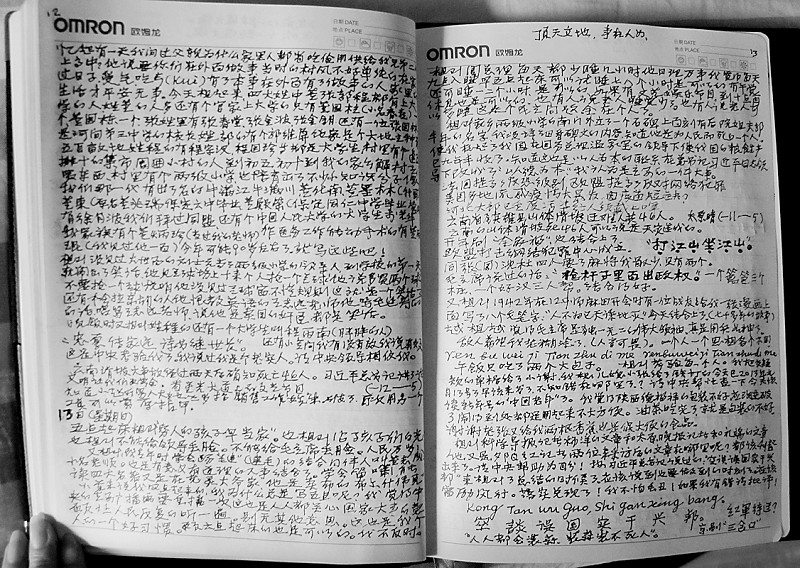 在老人的日记本上,记者看到,平均每天都要密密麻麻写满两页纸,足有两千字。在每天的日记中,都记录了国内、国外发生的重大新闻;也记录了老人在老年公寓生活的点点滴滴;还记录了老人年轻时候的辉煌。有叙述、有评论,虽有部分文字略显不连贯,但也足以展现出老人每天的心理状态。在“百岁”即将到来的时刻,他在期盼着这个对他来说有着特殊意义的新年。老革命家的十个想不到