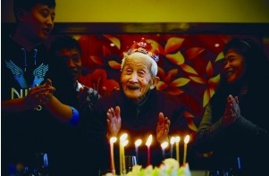 家人、徒弟为靖奎老爷子(中)过百岁大寿。