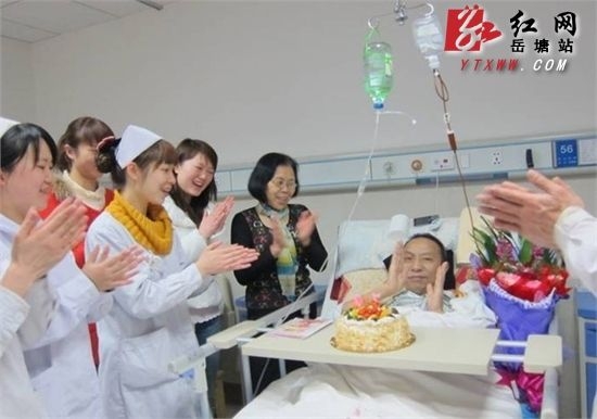 红网岳塘站2月3日讯(分站记者 何蔚 通讯员 彭丽彬)蛋糕、鲜花、生日歌……近日,湘潭市第一人民医院住院大楼钟老的病房内显得格外温馨。原来,医院肿瘤外科的医护人陪七旬患癌老人钟老度过了一个温馨的生日。