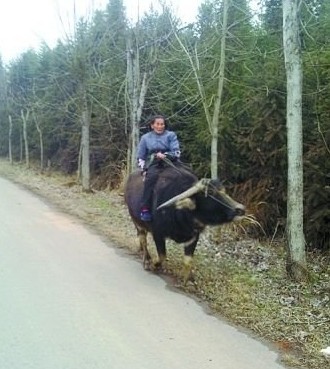 陈先生说,他小时候在乡下也骑过牛,上牛很需要技巧,他有时用一只脚抵住牛角,把缰绳往后一拉,牛会抬头顺势把他送上牛背上,有时他也会找个高的地方比如田埂,骑到较矮处的牛背上。这奶奶这大年纪,还能如此自如地骑牛赶路,真不简单啊。