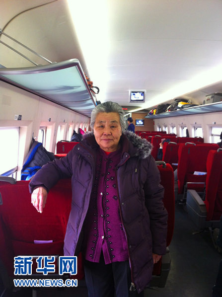 聂老太太1月26日乘坐刚刚全程贯通的京广高铁回湖北老家过年。第一次乘坐高铁,老太太高兴地让家人拍了一张留影照。(照片由聂老太太家人提供)