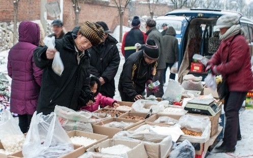 2月3日,是春节前最后一个周日,正逢农历腊月二十三小年。按照农村习俗,过了农历小年便要开始忙年了,北京延庆县刘斌堡乡山南沟村村民胡瑞一早起床,和老伴杨春仙合计着家里最后一批需要采买的年货。胡大爷今年71岁,耳不聋、眼不花,身体倍棒精神好,每年春节前的年货采购任务都是他的固定工作。 上午9时30分,胡瑞攥着年货清单,一溜小跑出了家门去赶春节前最后一个大集。与城里人到超市购年货不同,山区农民的年货是在大集上买的。周日在相隔不远的刘斌堡村的大集,是春节前的最后一个集了,虽然天空飘着雪花,还是没能挡住人们采买年货的热情。 瓜果蔬菜、海产品、日用品、服装鞋帽、福字春联……琳琅满目的货品、熙熙攘攘的人群、讨价还价的热闹场面,充满了浓浓的年味儿。“小孙女爱吃葡萄干。”刚一到地方,胡大爷嘴里就念叨着踅摸起干果摊。不一会儿功夫,胡大爷两手就拎了不少“战利品”。然后他又开始专心找卖花布的摊子,扯布。“你这花布哪种最好,要给刚出生的小娃娃做被子用,不嫌贵啊。”摊主听着胡大爷这么问,呵呵笑着搭话说:“现在都讲究舒服,对小宝宝来说,纯棉的面料是最舒服的。”在摊主的推荐下,胡大爷最终选中了一块浅黄色纯棉布料,“这块颜色好,男孩女孩都能用。” 这一趟大集赶下来,花销不小,但胡大爷一点不心疼。“现在日子越过越好,老人按月领养老金,年底乡里还给俺们这些农村老干部送了过年钱,买啥东西不手紧,幸福着哩。”