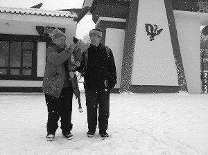 2月26日12时,记者在吉林市龙潭山遗址公园初见曾玉坤老人,风雪中,曾玉坤老人和老伴相互挽扶着,一边走一边不时停下用手中的相机拍摄四周的风景。记者注意到,曾玉坤老人满头白发,但精神矍铄,虽然已经83岁了,但老人耳朵不背,与人交流十分顺畅。