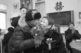 仪式正式开始后,孙子溪手捧一束红玫瑰,深情地望着谢美莉,“献给我亲爱的老伴。”趁着这个机会,谢美莉也对老伴“撒起娇来”,要求他说一遍“我爱你”,而且还得用英文。孙子溪一点也不含糊,立刻说出了心中最爱的那句誓言,“Ilovemywife.”此时,众人的起哄和鼓掌让婚礼达到了高潮,大家都让两位老人“亲一下”。孙子溪笑笑,立刻就在谢美莉布满皱纹的脸颊上印上了重重一吻。