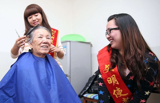 新疆网讯(记者陈星宇)2月26日,在85岁的仲月英老人家中,志愿者宋鑫鑫在为老人理发。