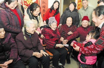 本报讯(记者 周和平 实习生 熊其雨)婆媳关系被认为是世上难解的一道“题”。前日,在岳麓区莲花镇大华村村民唐杨氏100岁寿诞上,83岁的媳妇唐秀英在给婆婆祝寿拍合影的同时,面对前来祝寿的镇、村干部和亲友,晒起了和睦的婆媳关系:“我当了60多年的媳妇,和婆婆没吵过嘴,没红过脸!”