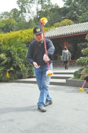 “我有一条洁白的哈达,伴我走出喜马拉雅……”昨日上午,人民公园里,85岁的张福斌一边唱着歌,一边舞着花棍,他将这称为“音乐花棍”。单看张福斌的姿势、神态,不会想到他是一位癌症晚期病人,并且患有多年的冠心病和高血压。