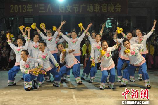 在温泉村举办的三八节联谊晚上上,妇女们在表演《老妈妈》。 蒙钟德 摄