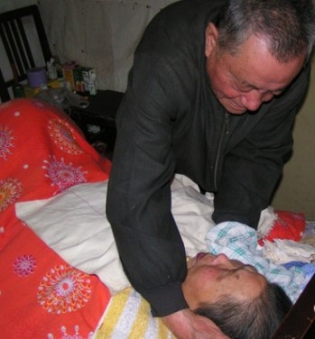 走进范慕岳的家,光线有些暗,记者吃力地看到,里面正对着门的床上睡着一位老人。“这是我老伴刘继英,瘫痪5年了。”范慕岳拉开电灯说。记者看到,刘继英面色红润,头发浓密,只有少许白发。看到范慕岳进来,老人脸上露出了笑容。“她不能说话,但心里啥都知道。”范慕岳说。