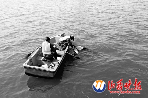 汾河公园打捞队的工作人员正在打捞死者