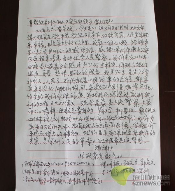 深圳新闻网3月18日讯(记者 梁沅)2013年3月11日下午,两位年迈老人的身影出现在人口科户政大厅内,他们缓缓地走向咨询台,亲切的说道:“我们的户口已经顺利办完了,这次是来送给你们送感谢信的。”