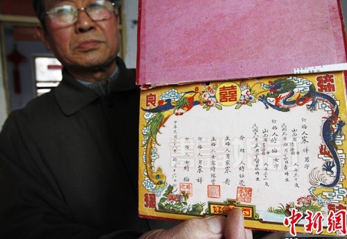 3月19日,河南开封证书收藏老人张洪军展示1948年的结婚证,上面印有“鸾凤和鸣”字样,边饰华丽、精致。中新社发 王中举 摄