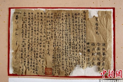 图为张洪军收藏的清朝咸丰年间的婚书。婚书记载为清朝咸丰四年(1856年)的大婚合卺父母、吉日婚书,内容大致为如何消除夫妻相冲,以及开脸、拜见对方父母、洞房花烛吉时等内容。中新社发 王中举 摄