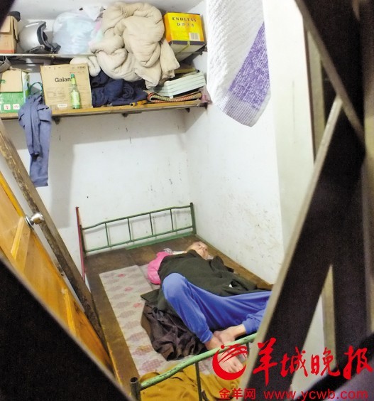 众街坊口中的“杂物间”位于大良街道云桂二街小区三座。掀起门口的挂帘,从铁栅栏的空隙望进去,一张床几乎占了整个杂物间的大部分空间,一位老人瘫睡在床上,记者多次尝试与其打招呼,只见他一动不动,毫无反应。